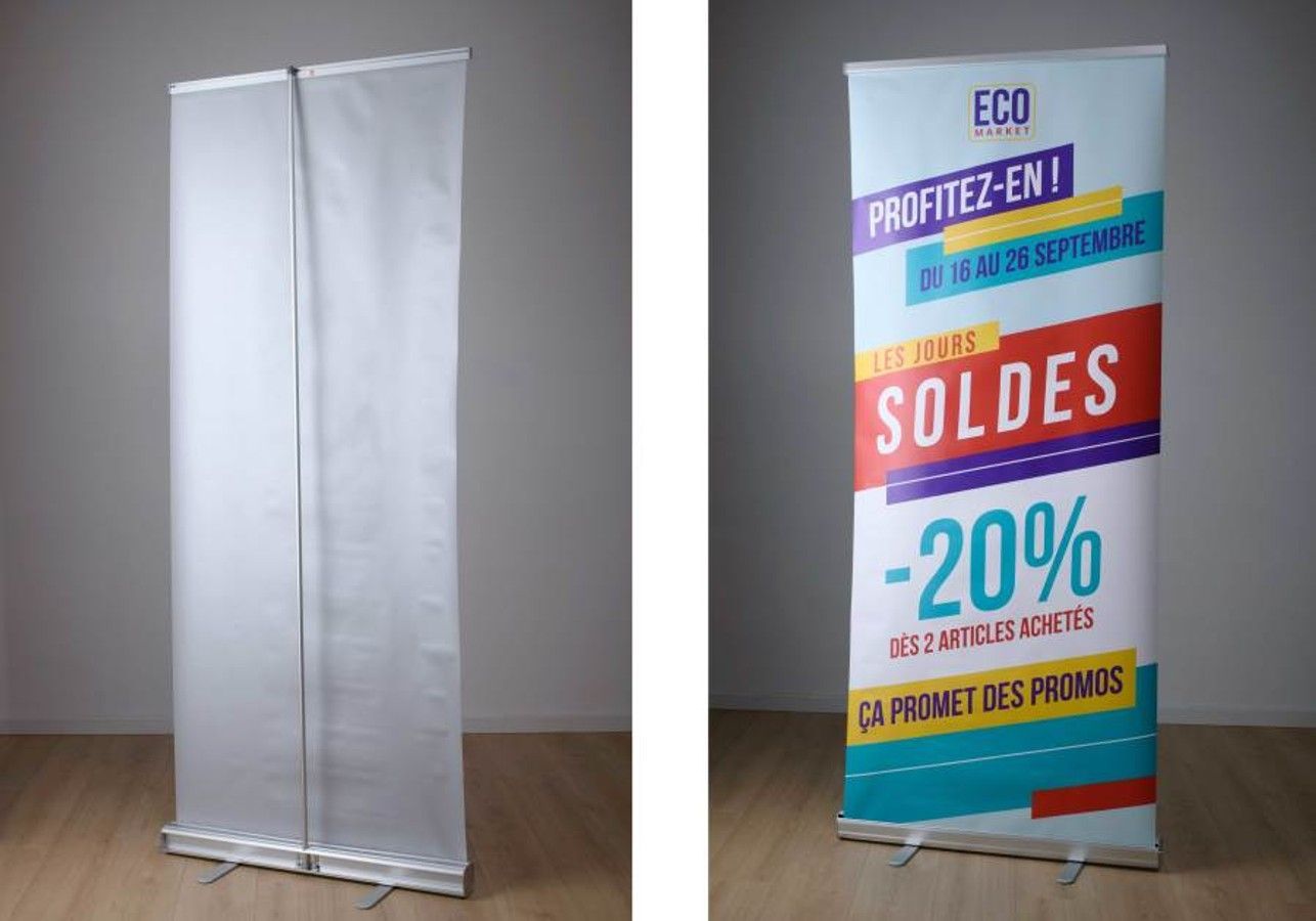 Le Roll-up est un support de communication incontournable pour toute sorte d'activité, salons, conférences, expositions et autres événements pour accroître la visibilité de votre entreprise, société, établissement, association à but non lucratif, une administration, un club ou une organisation sportive. Selon vos besoins, nous le déclinons dans différents formats allant de 84 x 204 cm jusqu'à 200 x 300 cm. Facile à installer comme à ranger grâce à un système d'enrouleur, vous pourrez l'emmener partout avec vos dans un sac de transport vendu avec le support.
