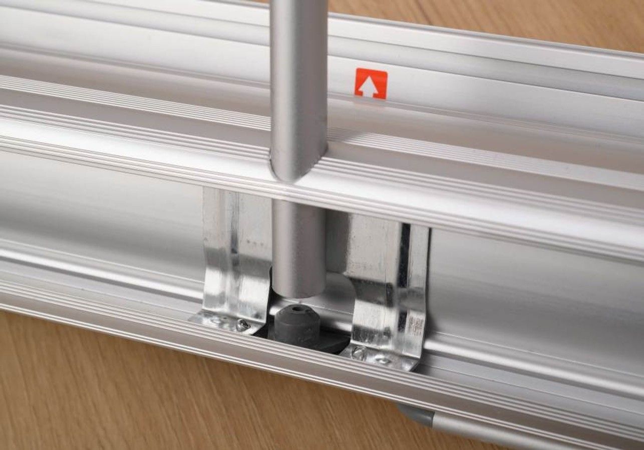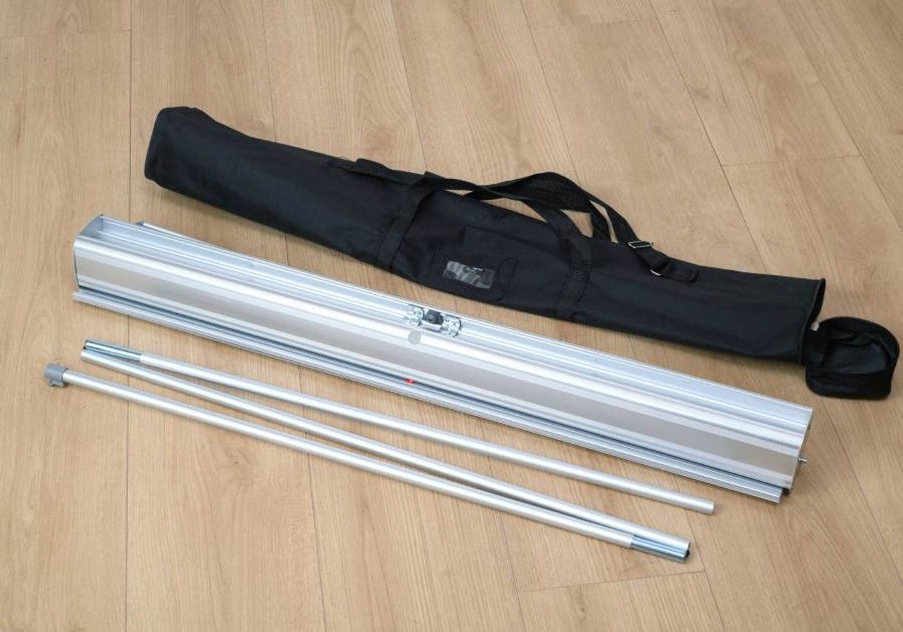 Éléments roll’up : Enrouleur + 1 mât + 2 pieds stabilisateurs